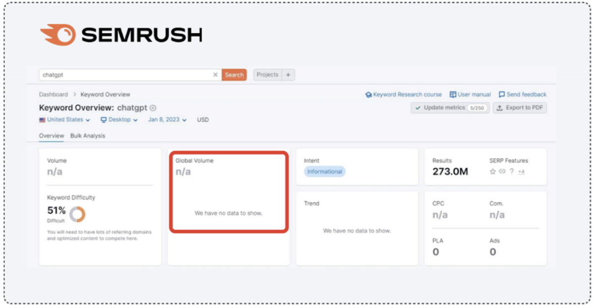 Despite this, Semrush, a leading solution for Google search volume, showed zero searches for the term, despite listing over 273 million search results.